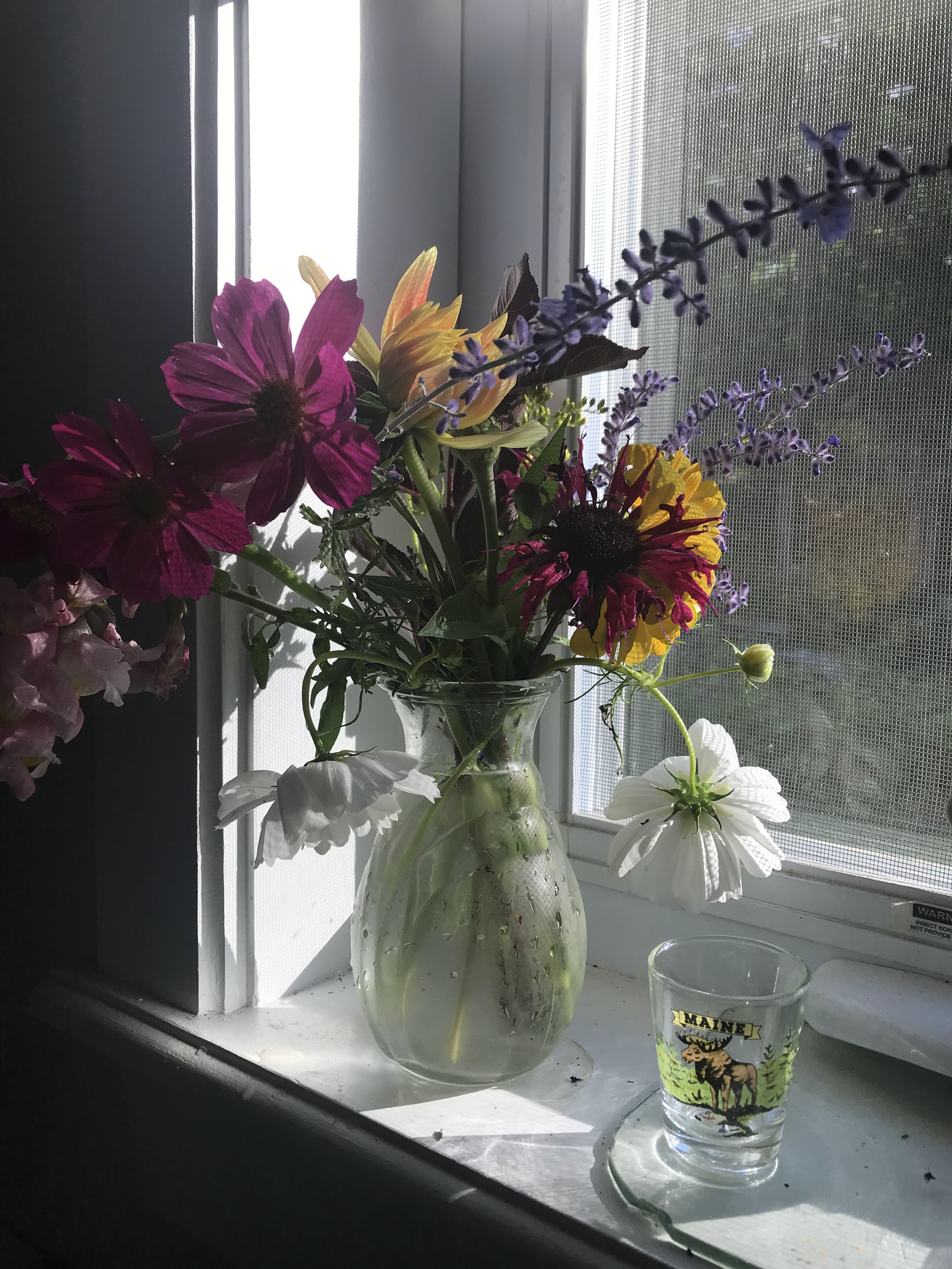 On the bookcase in my writing room, there is a small shrine that gives me so much pleasure to look at. There is a print of water glimmering on the shore as evening approaches the coast of Monhegan Island. It is a beautiful artist’s capture of inky blues and golden waning light, but it is also a reminder of the adventure that I was lucky enough to share with my beloved sister who has since passed. When I see that picture, I think of the walks we shared on the rocky coast and the glasses of wine sipped on the inn’s porch looking at the clouds float by.